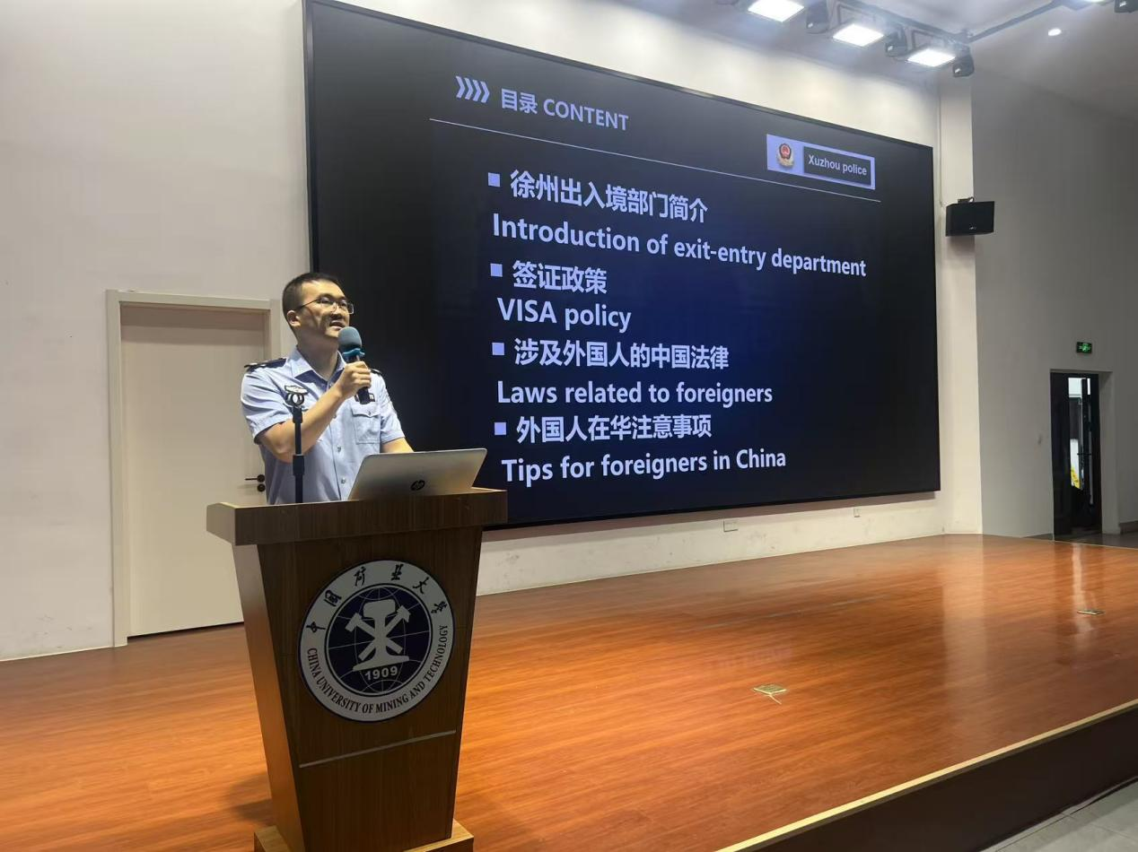 为加强我校来华留学生的日常管理,普及中国法律法规知识,增强学生的安全意识,帮助新生顺利开启在华学习和生活,9月27日上午,学院在懋苑大学生活动中心举办2025级来华留学生法律法规专题讲座。280余名预科生及语言进修生参加此次活动。国际学院副院长房坤、徐州市公安局出入境管理支队王成警官及学院国际学生辅导员出席讲座。
