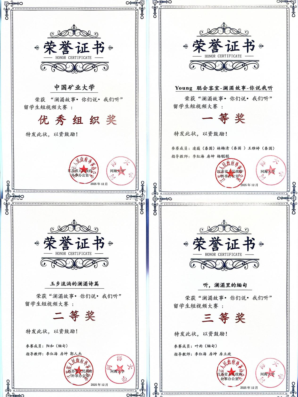 2025年12月7日,由江苏省人民政府外事办公室与河海大学联合主办的“澜湄故事・你们说・我们听”留学生短视频大赛颁奖典礼在河海大学江宁校区圆满举行。我校凭借积极组织以及优秀参赛表现,荣获优秀组织奖。5名国际学生凭借真挚动人的作品脱颖而出,分别斩获一、二、三等奖。