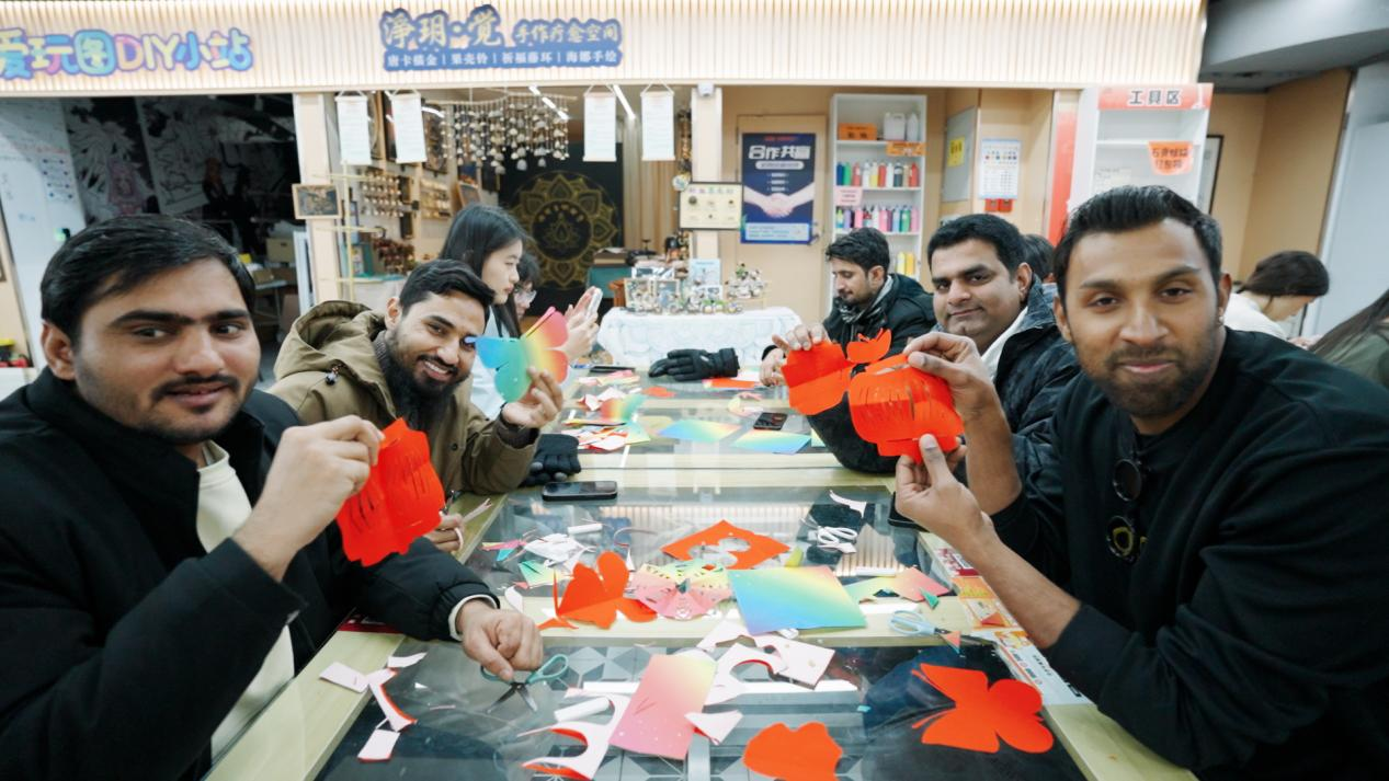 下午的行程移步至充满创意的手作梦工厂。在这里,传统非遗以互动体验的形式焕发新颜。留学生们首先尝试了剪纸艺术。在剪纸艺人的悉心指导下,一双双略显生疏的手执起红纸与剪刀,从简单的窗花图案开始,红纸翻飞间,不仅剪出了精美的作品,更剪出了对中国“红火吉祥”春节美学的直观理解。随后,大家兴致勃勃地投入麻叶的制作体验。麻叶与馓子同属节令油炸面点,但形状风味各异。和面、擀皮、切割、捏花,留学生们在师傅的指点下亲手完成每一道工序。当自己制作的麻叶在油锅中翻滚、膨胀、变得金黄酥香时,成就感与喜悦油然而生。品尝着自己劳动成果的同时,也深刻体会到中国人通过共享美食传递温情、庆祝团圆的节日内涵。