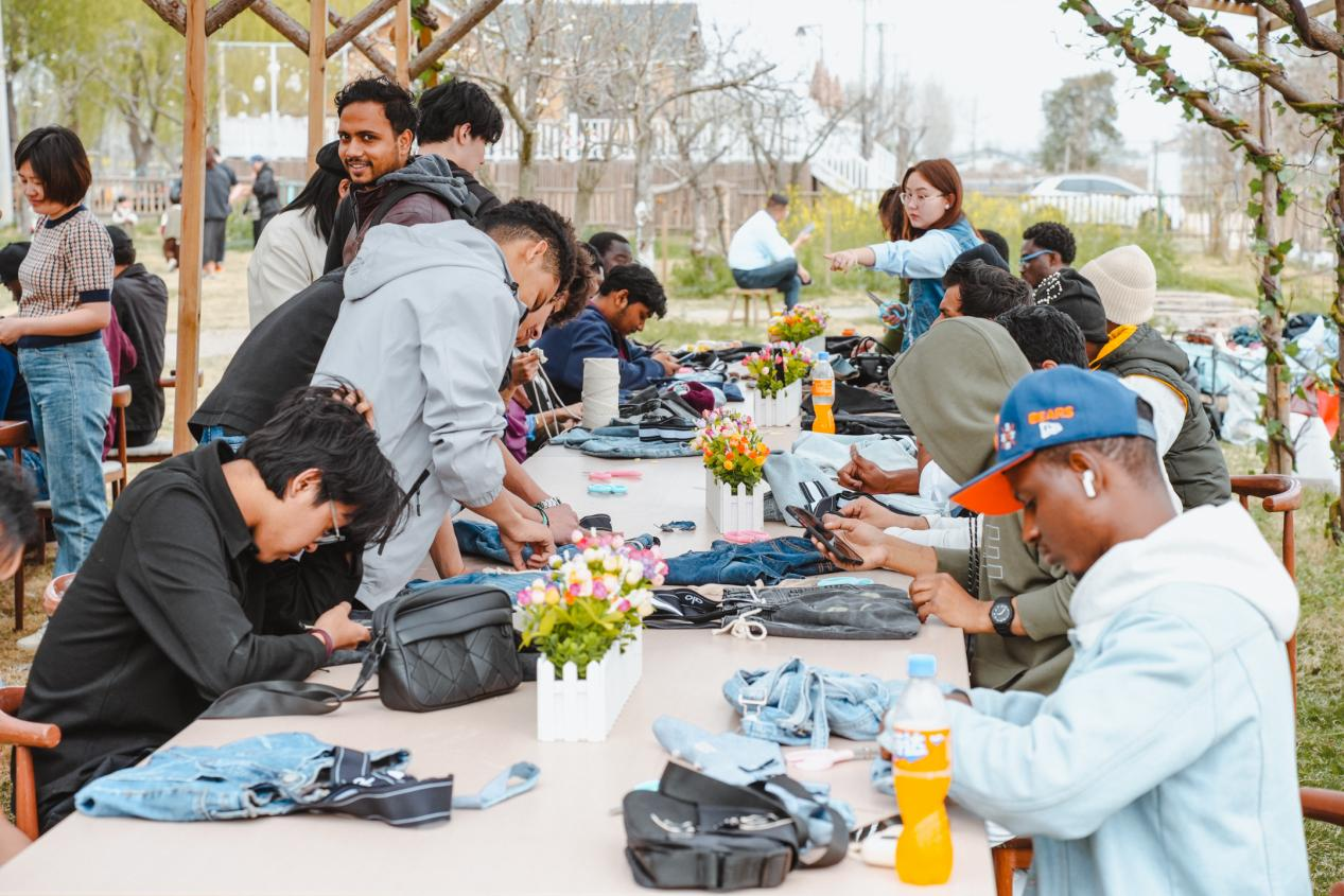 下午的手工实践让留学生在微观层面践行“无废”理念。在手工活动现场,“旧牛仔裤改造环保包”活动顺利推进,专业老师详细讲解拆解、剪裁、缝合等核心步骤,指导大家让闲置牛仔裤重焕生机。拿到工具后,留学生们结合上午所学的循环理念进行创作:有的保留原始口袋以增强实用性,有的用余料拼接图案,俄罗斯籍学生尼克还将水洗标设计为“身份牌”。两小时里,活动现场同学们协作交流、分享创意。看着亲手制作的个性环保包,几内亚籍学生柯尔娜感慨道:“保护环境要从身边闲置物品着手,如此方有意义。”