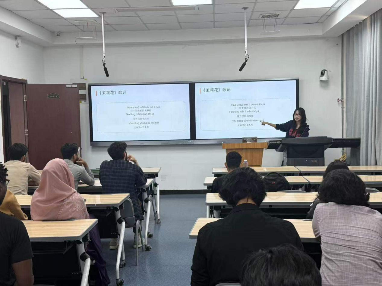 核心环节聚焦生活汉语场景模拟,围绕请假、取寄快递、宿舍设施报修、相约图书馆等四大类高频校园场景,搭配关键词提示与AI辅助表达模板,引导大家从敢说到会说、从会用到用好。小组讨论、AI辅助、场景迁移层层递进,让汉语学习更实用、更高效。随后,大家学唱经典民歌《茉莉花》,在优美旋律中感受汉语的韵律之美,沉浸式体验中华优秀文化;活动的最后,大家合影留念,定格下这段温暖而有爱的学习时光。